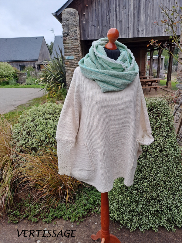 Les créations de Claire sont réalisées en laine, lin, coton et soie. Le choix des coloris est influencé par sa formation de base d’architecte paysagiste. L’ensemble des tissages découle de la nature avec une prédominance de vert.